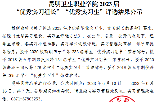 昆明卫生职业学院2023届“优秀实习组长”“优秀实习生”评选结果公示