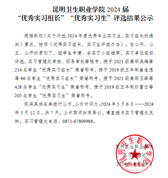 昆明卫生职业学院2024届“优秀实习组长”“优秀实习生”评选结果公示