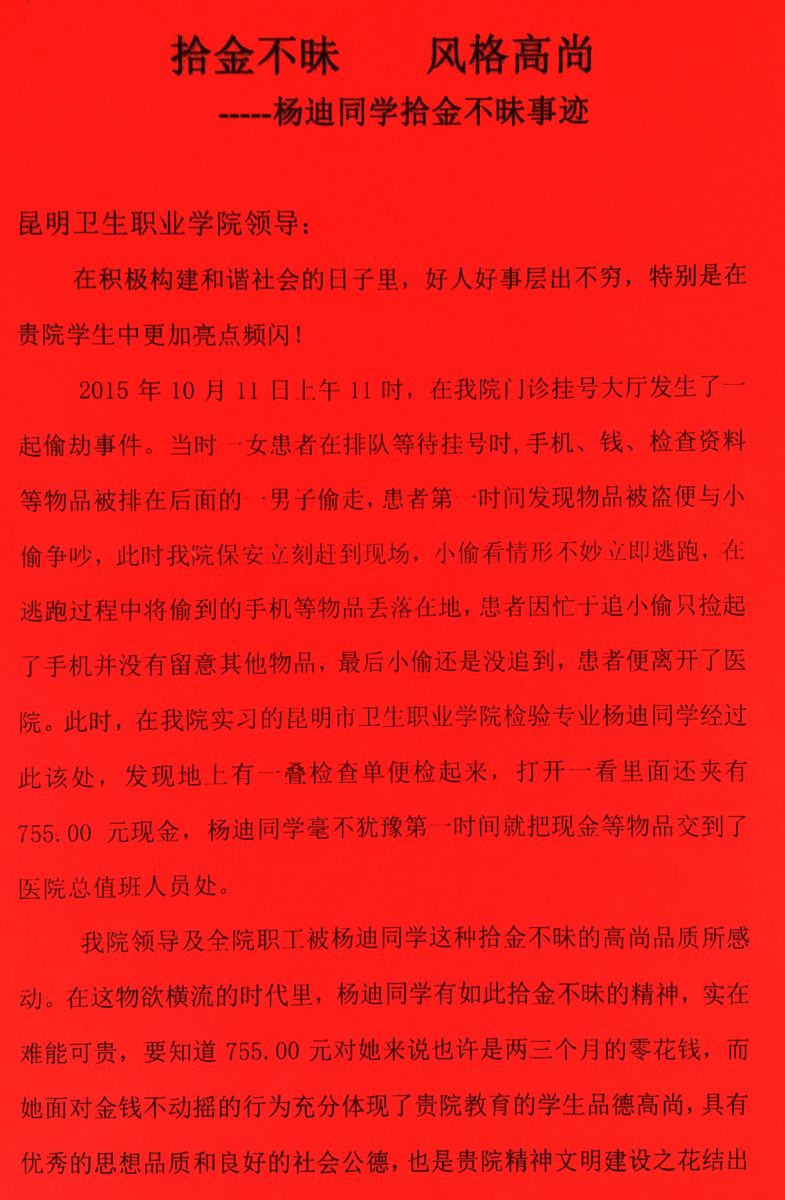 官渡区人民医院发来我院实习生杨迪同学拾金不昧表扬信