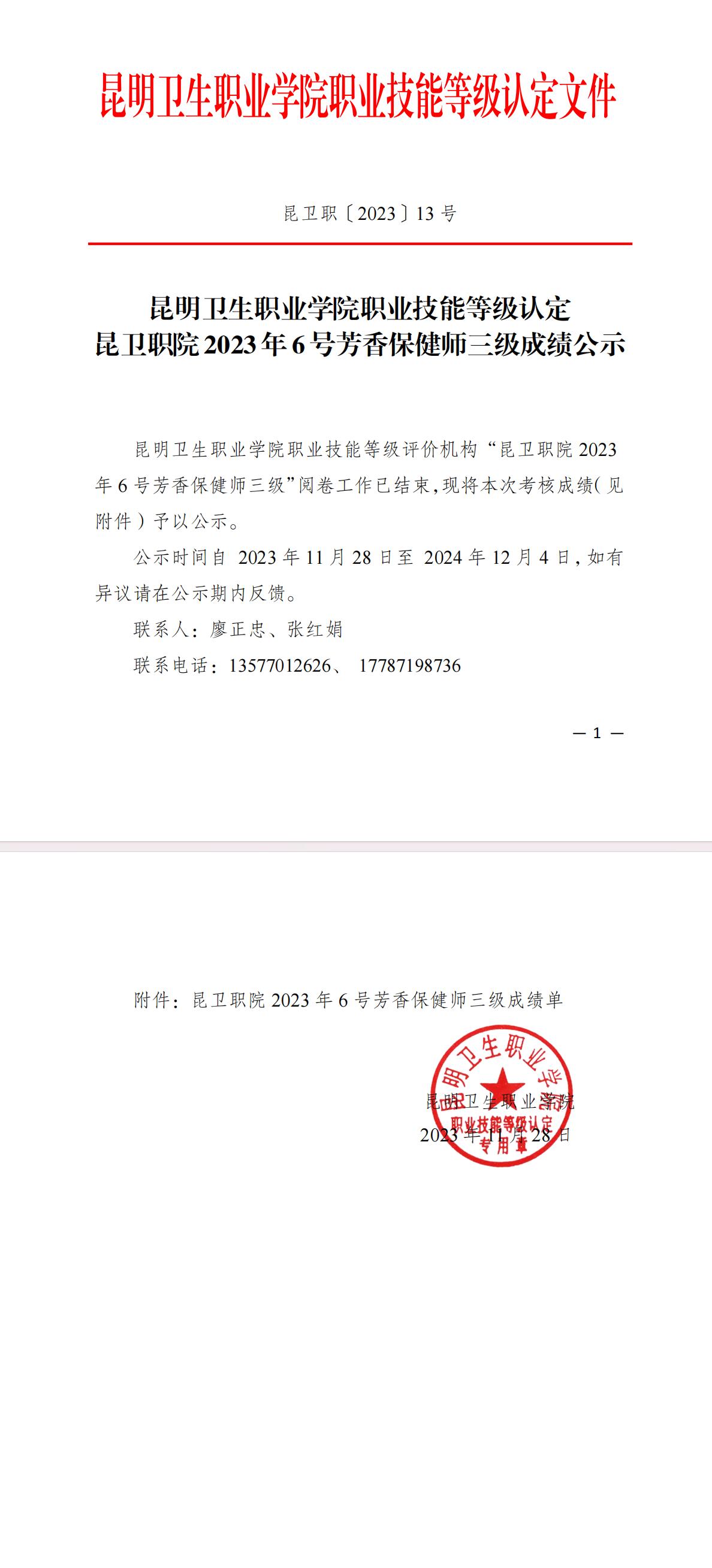 昆卫职院2023年6号芳香保健师三级成绩公示