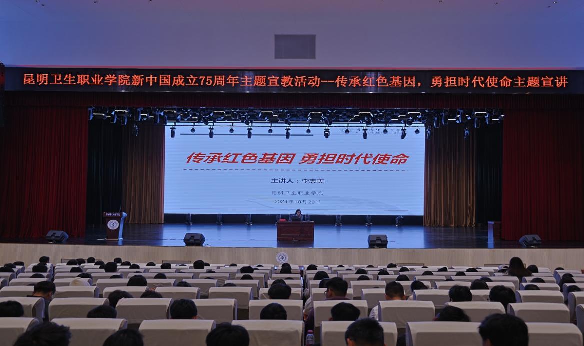 为热烈庆祝中华人民共和国成立75周年,致敬伟大祖国,弘扬爱国主义精神,持续引导广大青年学子坚定理想信念,进一步增强历史责任感和使命感,展现全体师生爱国爱党、团结奋进的精神,10月29日晚,马克思主义学院组织开展张桂梅思政大讲堂暨新中国成立75周年主题宣讲活动,活动以讲座形式开展,主题分别为“传承红色基因,勇担时代使命”和“石榴花开成长路,民族团结展新颜”,学校各党(总)支部书记、宣传委员、部分辅导员及学生代表1000余人参加,马克思主义学院青年骨干教师李志美和李思雨主讲。