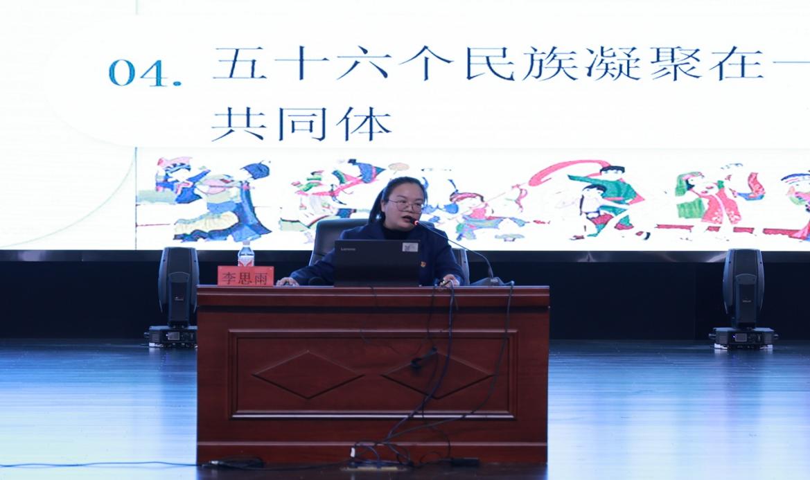 中华民族共同体建设,是建立在各民族共同团结奋斗、共同繁荣发展基础上的实践。李思雨老师围绕“石榴花开成长路,民族团结展新颜”主题,从籽籽紧联,民族不朽;石榴花开,民族振兴;果实丰硕,共筑复兴等内容进行讲述,并告诉同学们只要各民族精诚团结、共同奋斗,就没有任何力量能够阻挡中国人民实现梦想的步伐,广大青年学子要努力学习,为中华民族共同体建设贡献力量。