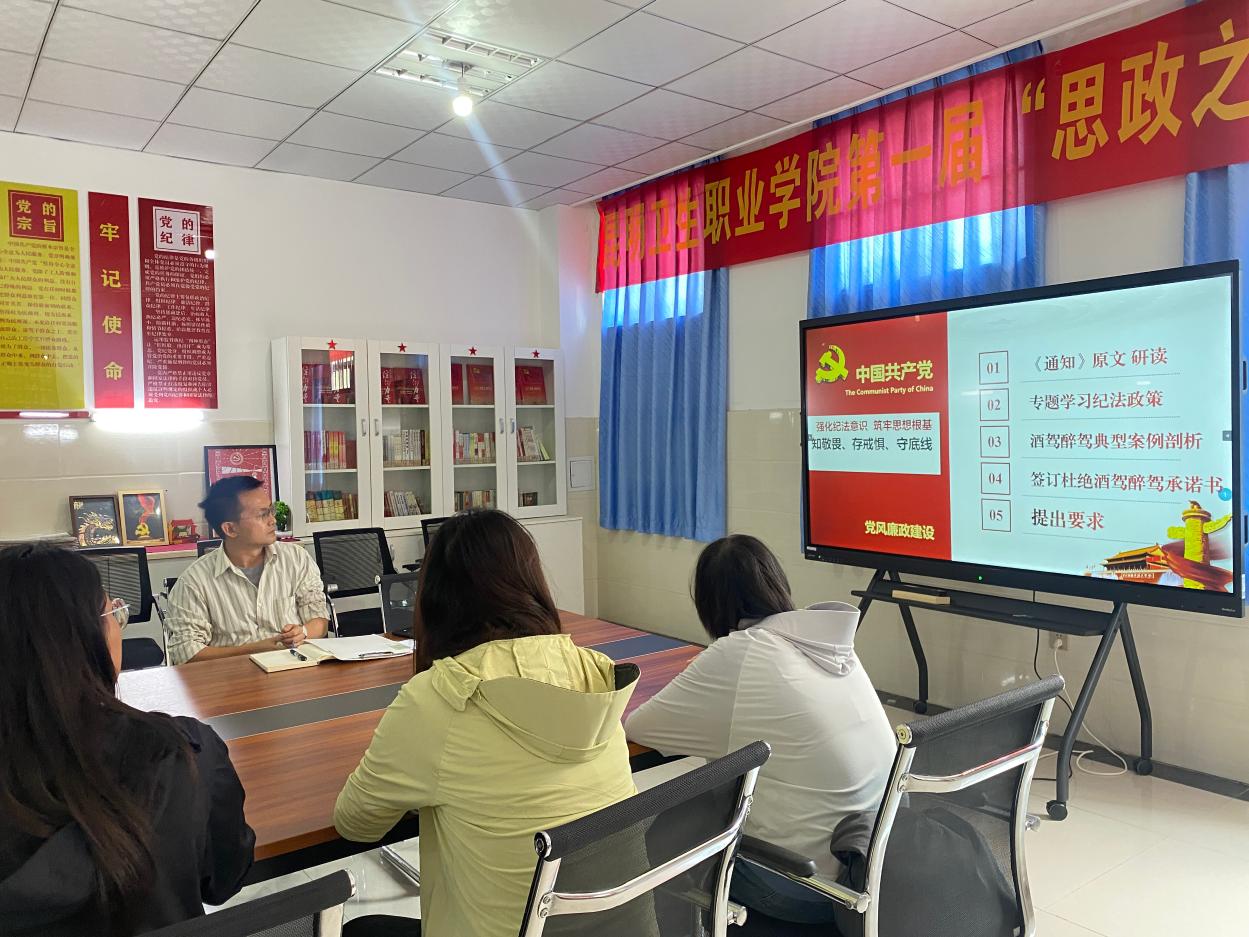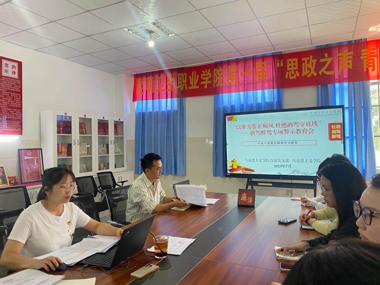 为深入贯彻中央八项规定精神,严肃纠治违规饮酒问题,强化教师纪法意识与师德师风建设,2025年7月15日,中共昆明卫生职业学院马克思主义学院直属支部委员会召开 “以案为鉴正师风 杜绝酒驾守底线” 酒驾醉驾专项警示教育会。本次会议以支部党员大会扩大会形式举行,参会人员除支部全体党员外,还涵盖学院全体普通教师,由支部书记主持并主讲,马克思主义学院院长作总结强调。
