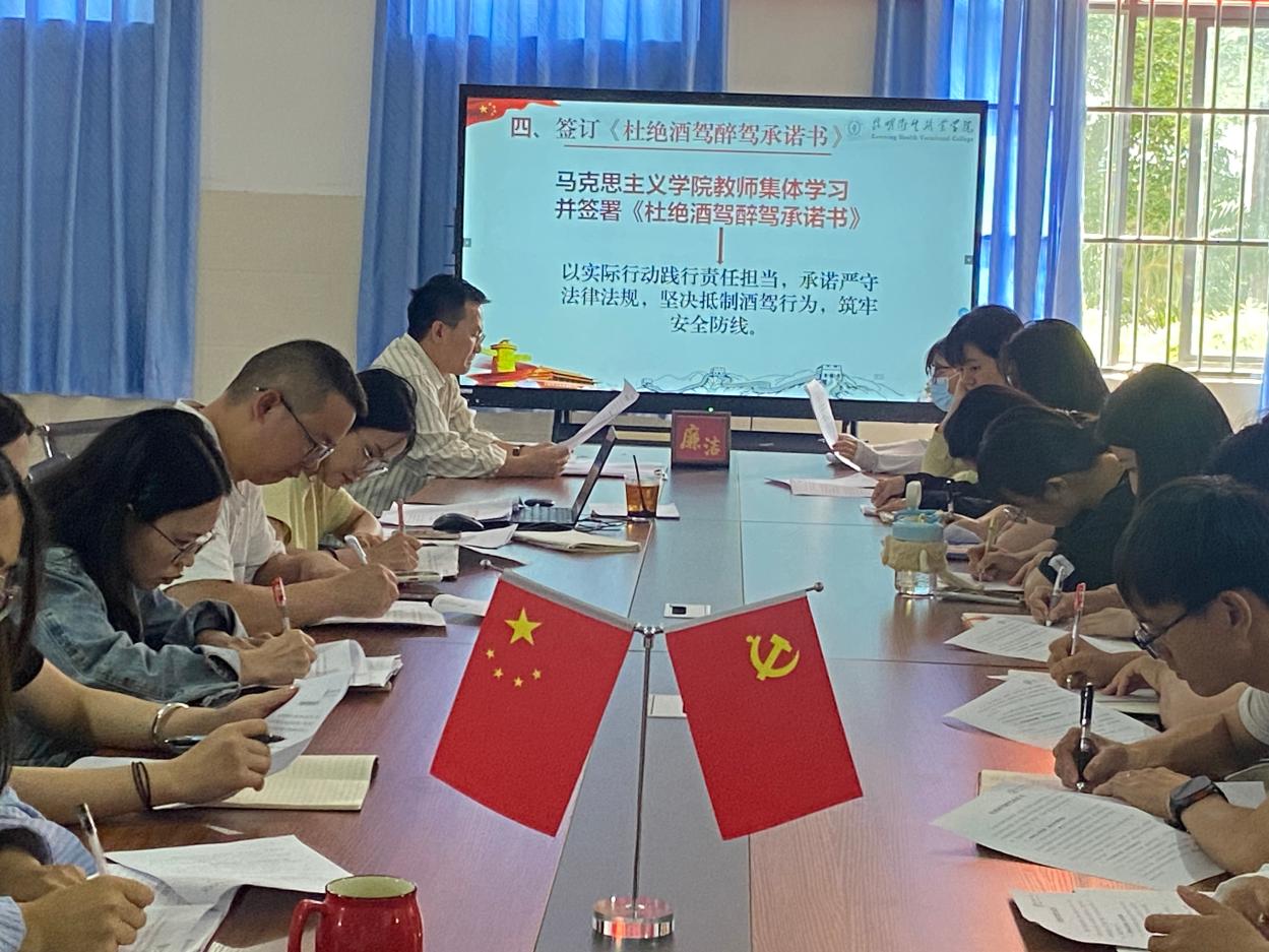 警示教育后,马克思主义学院全体教师集体学习并签订《杜绝酒驾醉驾承诺书》。党员教师带头签署,承诺以更高标准严格自律,发挥先锋模范作用;全体教师共同承诺严守法律法规,坚决抵制酒驾行为,筑牢安全防线。
