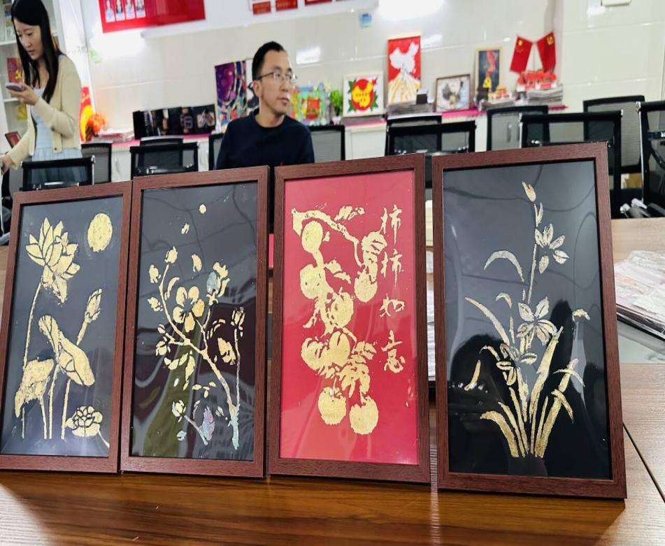 活动现场设置了金箔画烧箔画、流沙画、非遗烧蓝点翠、石膏立体浮雕彩绘四大手工体验区。教职工们积极参与,在金箔画中感受传统纹样的璀璨光芒,在流沙画里体悟“润物无声”的教育哲思,在烧蓝点翠工艺中领悟文化传承的责任,在石膏彩绘创作中激发创新灵感。大家在动手实践中放松身心,也在协作交流中拉近了距离,团队凝聚力进一步提升。