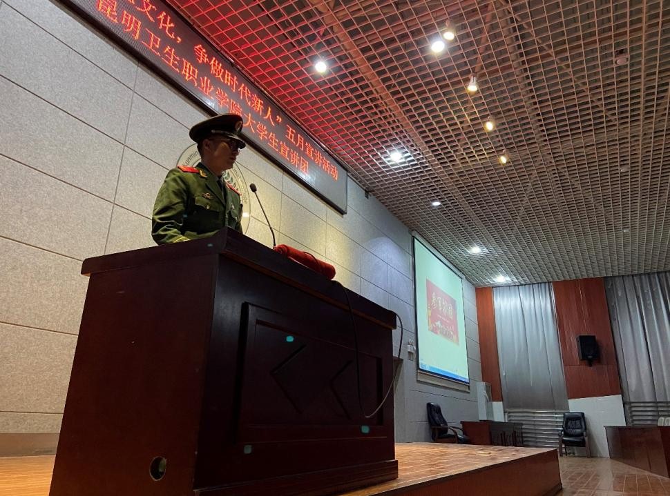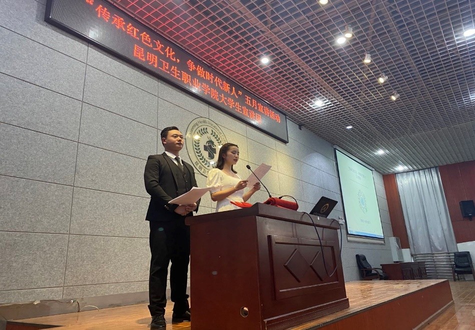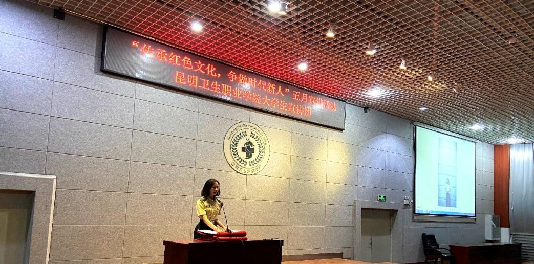 传承红色文化,其所蕴含着爱国主义、优秀革命传统文化,集体主义等精神内涵和价值追求,已经沉淀为当今社会主义先进文化和社会主义核心价值观的重要特征,成为激励当代青年奋勇前进,走好新时代长征路的精神动力。我们现在的幸福生活是先烈们用自己宝贵的生命换来的,他们的牺牲换来了祖国的繁荣富强,作为青年的我们,应当自觉将红色基因贯穿和践行于社会主义核心价值观实践中,从红色文化,红色基因中汲取奋斗的力量。为此,昆明卫生职业大学生宣讲团于5月17日在学术报告厅开展了“传承红色文化,争做时代新人”五月宣讲活动。首先由胡春同学以《铭记历史,不忘国耻,争做时代新青年》为主题宣讲拉开本月宣讲活动的序幕。