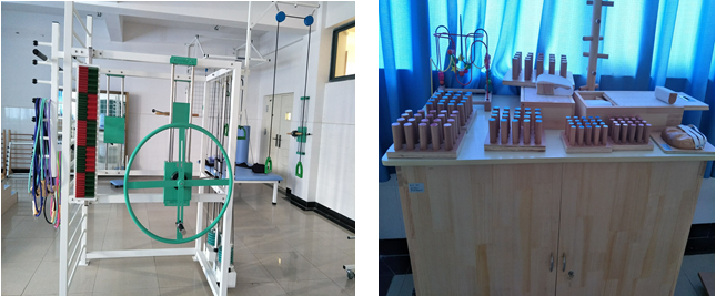 腕关节旋转器、上肢协调功能练习器、体操棒与抛接球、股四头肌训练板、手支撑器、作业训练器、分指板、木插板、OT综合训练工作台、系列沙袋、言障碍治疗仪、吞咽治疗仪、认知图形插板、言语训练卡片;模拟作业工具、平衡协调训练器;轮椅等实训设施等。能满足《言语治疗技术》、《作业治疗技术》等课程的实训教学,实现各门核心技术课程的理实一体化教学。目前开设的实训项目有功能性作业疗法、设计和选择相应的作业活动、日常生活活动能力训练、职业前的作业疗法、辅助器具的使用、言语障碍的评定及言语障碍的治疗训练等。