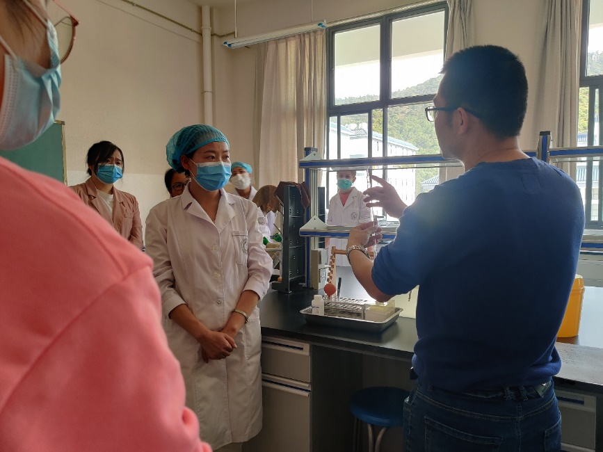 为了加强学院间的交流合作,实现资源共享、优势互补,提高教师专业素养,进一步凝聚提升课堂教学智慧和课堂教学效率,6月24日下午,基础医学院化学教研室与检验学院生物化学检验教研室开展了联合备课,一同对“化学相关课程”进行梳理、探讨、学习。(图1,罗正超副院长演示刻度吸管使用规范)罗正超副院长指出:时值职业教育全面改革之际,为更好落实提质培优精神,两个教研室的老师要多沟通交流,共同制定可行的备课方案并切