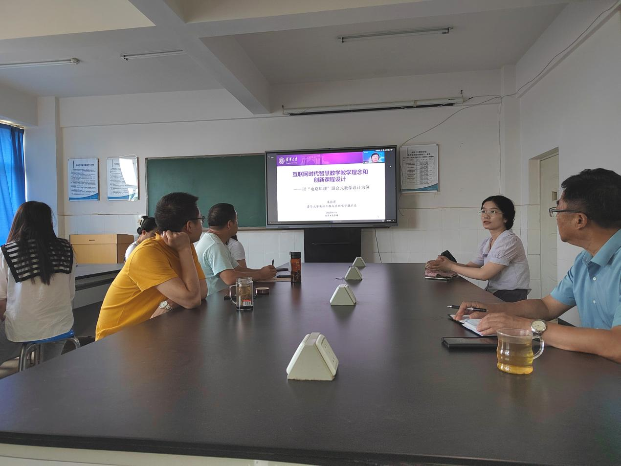 随着我国教育事业的发展,教学模式的不断变革,教学改革已成必然之势。为加快教育教学改革,促进教师与时俱进,提升教师教学能力,提高教育教学质量,7月14日下午14:00,基础医学院组织全体教师共同学习了由清华大学朱桂萍教授讲授的网络直播课--“互联网时代智慧教学理念和创新课程设计”。朱教授以“电路原理”混合式教学设计为例,全方位地讲述了在互联网时代下,进行智慧教学和课堂创新的意义,以及如何利用互联网资