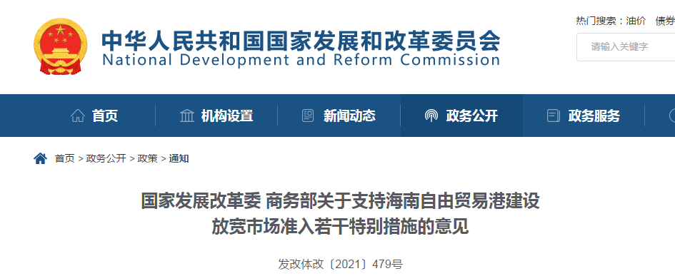 4月8日,国家发展改革委、商务部联合下发《关于支持海南自由贸易港建设放宽市场准入若干特别措施的意见》(发改体改〔2021〕479号)。